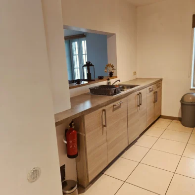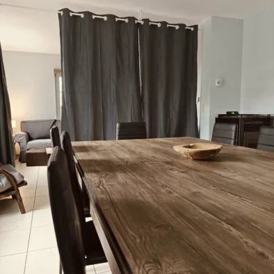 - Un grand espace ouvert comprenant un salon, une salle à manger avec table convertible en billard, un baby-foot et une cuisine avec équipements: four traditionnel, micro-onde, frigo avec petit congélateur, plaque vitrocéramique et des petits équipements tels que grille-pain, machine à café Senseo, appareil à raclette-grill, appareil à fondue, …
