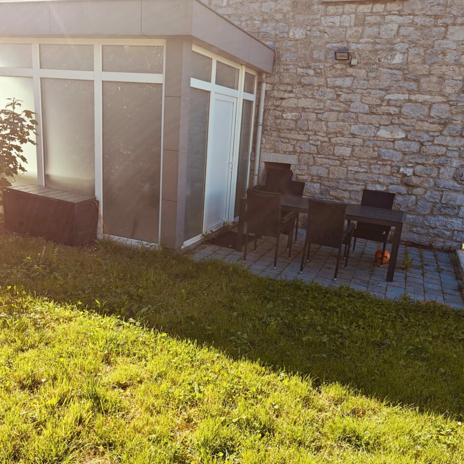 Une terrasse avec agréable jardin, une table et des chaises pour profiter pleinement.