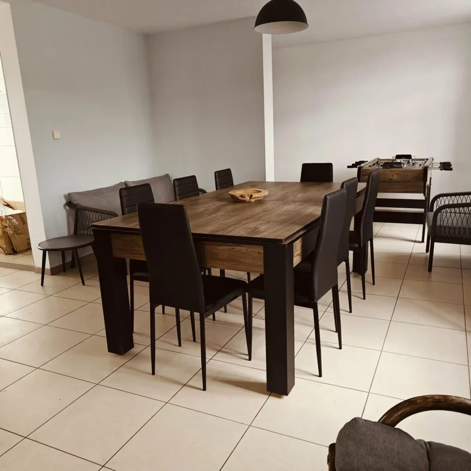 - Un grand espace ouvert comprenant un salon, une salle à manger avec table convertible en billard, un baby-foot et une cuisine avec équipements: four traditionnel, micro-onde, frigo avec petit congélateur, plaque vitrocéramique et des petits équipements tels que grille-pain, machine à café Senseo, appareil à raclette-grill, appareil à fondue, …